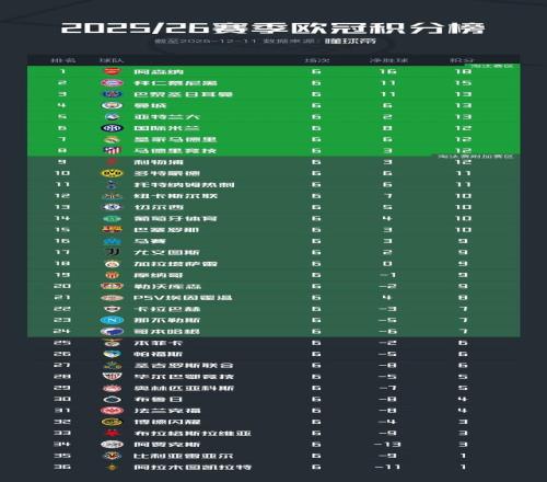 北京时间12月11日,2025/26赛季欧冠联赛阶段结束了第6轮的全部较量,积分榜的形势也产生了进一步的变化。